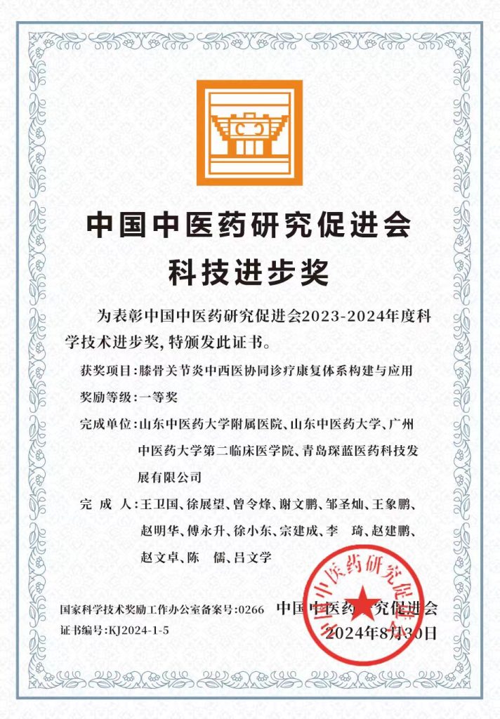 由青岛琛蓝医药科技发展有限公司联合山东中医药大学附属医院、山东中医药大学、广州中医药大学第二临床医学院,共同参与完成的“膝骨关节炎中西医协同诊疗康复体系构建与应用”,获得“中国中医药研究促进会科技进步一等奖”。