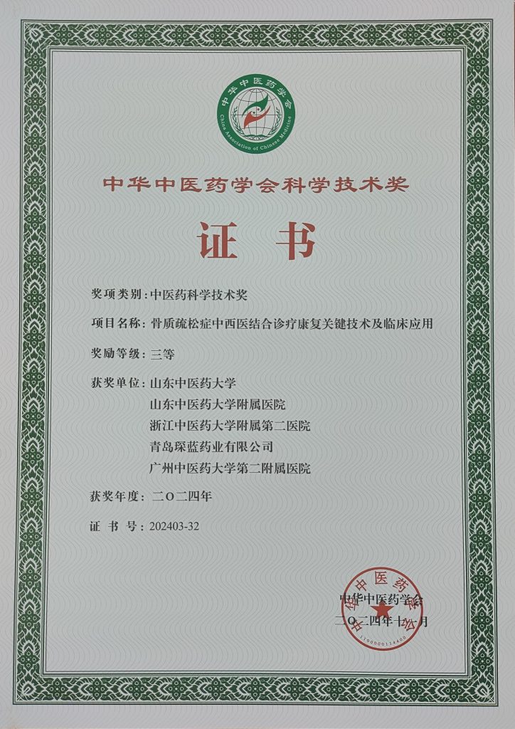 由青岛琛蓝药业有限公司联合山东中医药大学、山东中医药大学附属医院、浙江中医药大学附属第二医院、广州中医药大学第二附属医院,共同参与完成的“骨质疏松症中西医结合诊疗康复关键技术及临床应用”,获得“中华中医药学会科学技术三等奖”。
