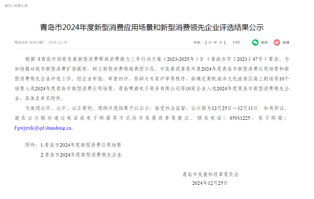 根据《青岛市培育发展新型消费释放消费潜力三年行动方案(2023-2025年)》要求,为加快推动青岛市新型消费扩容提质,树立新型消费领域典型示范,青岛市发展改革委公布2024年度青岛市新型消费应用场景和新型消费领先企业评选结果。