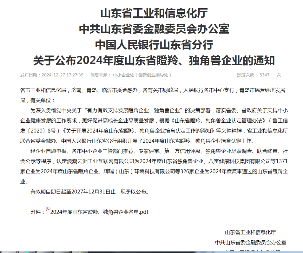 近日,2024年度山东省瞪羚、独角兽企业名单正式公布,经企业自愿申报、各市中小企业主管部门推荐、专家评审、第三方信用评级、独角兽企业尽职调查、联合终审、社会公示等程序。