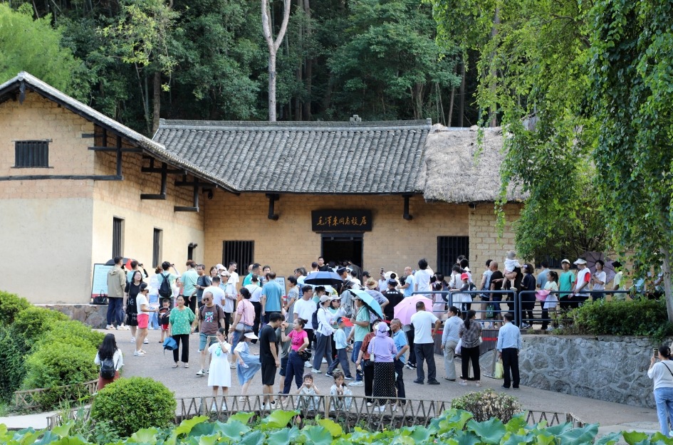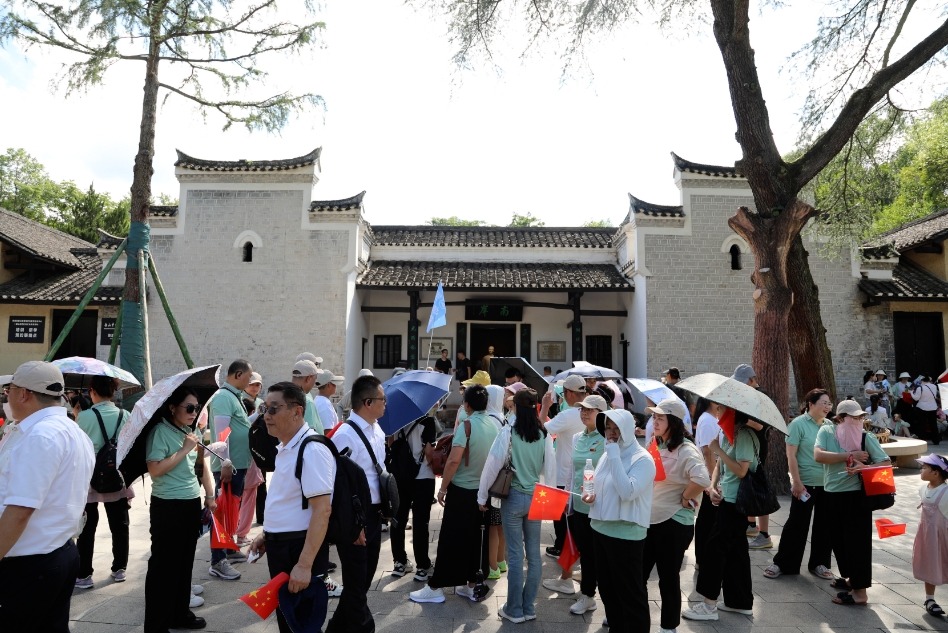 精英们有序排队仔细观看毛泽东主席从少年到青年的真实生活场景,在这个普通民居中他已经埋下了坚定信仰和远大理想的种子。
