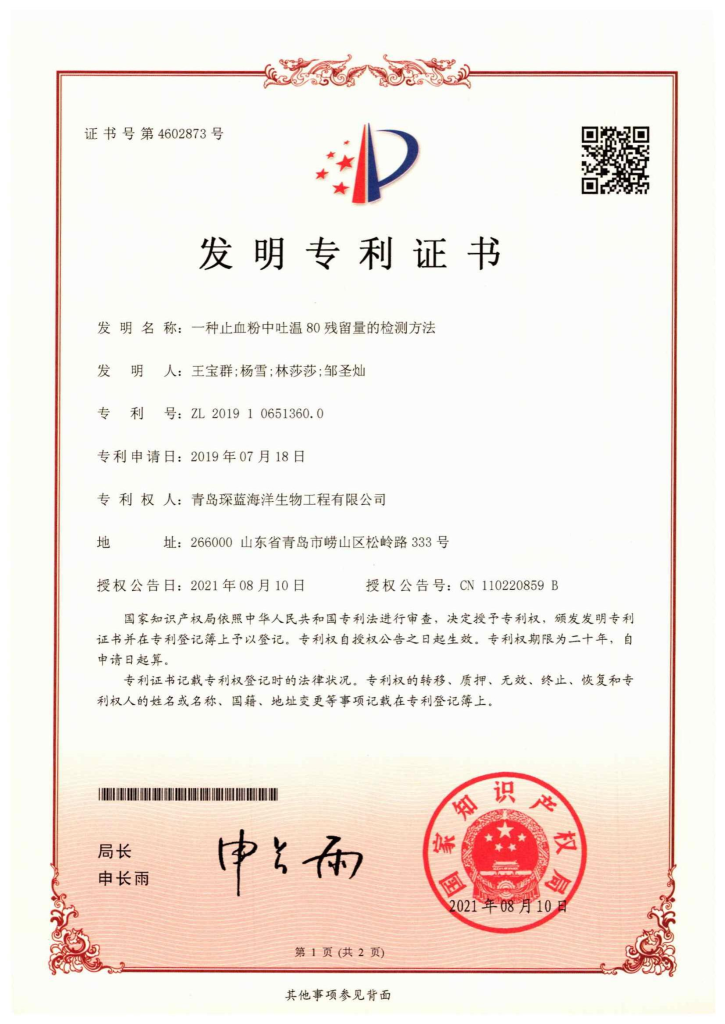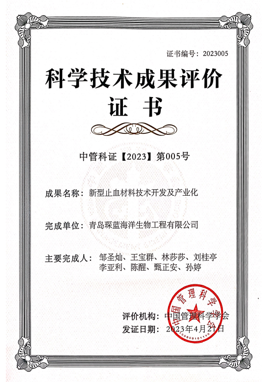 琛蓝可吸收止血微球已获得5篇中国发明专利,1篇美国专利,发表2篇中文论文,产品经中国管理科学学会评价达到“国际先进水平”。