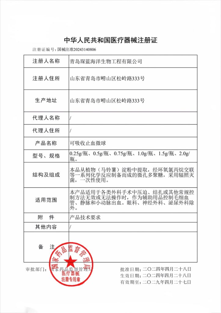 近日,由琛蓝健康与天津医科大学顾汉卿教授团队联合研发的三类医疗器械可吸收止血微球,正式获批《中华人民共和国医疗器械注册证》,申报时长比常规用时缩短近一年。
