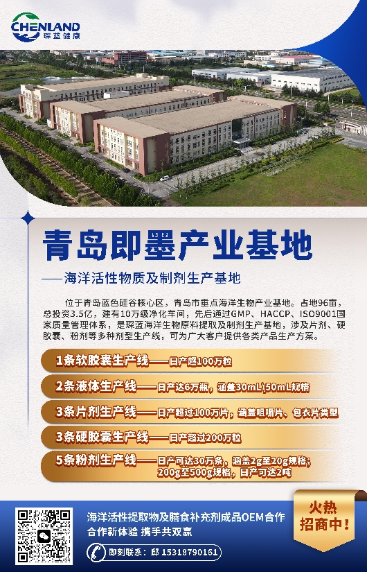 琛蓝健康产业集团在本届药博会主入口展板拥有醒目LOGO,在核心位置设立高标准展位,集中展出功能性营养产品体系、品牌中药原料系列,并全面展现出集团公司以“海洋+中药”为产业发展方向,在产业布局、科研平台、生产链条以及ODM\OEM等领域所积累的雄厚实力和取得的优秀成绩,标志着琛蓝健康多年来凭借卓越的创新研发生产能力和代加工能力,已经形成极具行业竞争力的品牌优势。