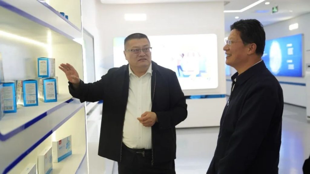 在丁伟总裁的陪同下,孟庆斌主席一行参观了琛蓝健康科技馆。科技馆内陈列着企业二十年来的发展成果,从初创时期的艰辛探索,到如今五大事业板块的卓越成就,一帧帧影像、一项项荣誉,生动地展现了琛蓝健康的成长之路。